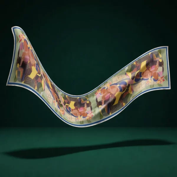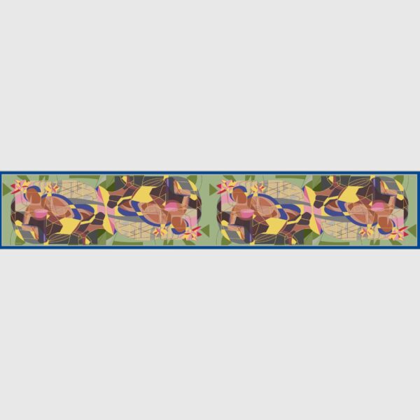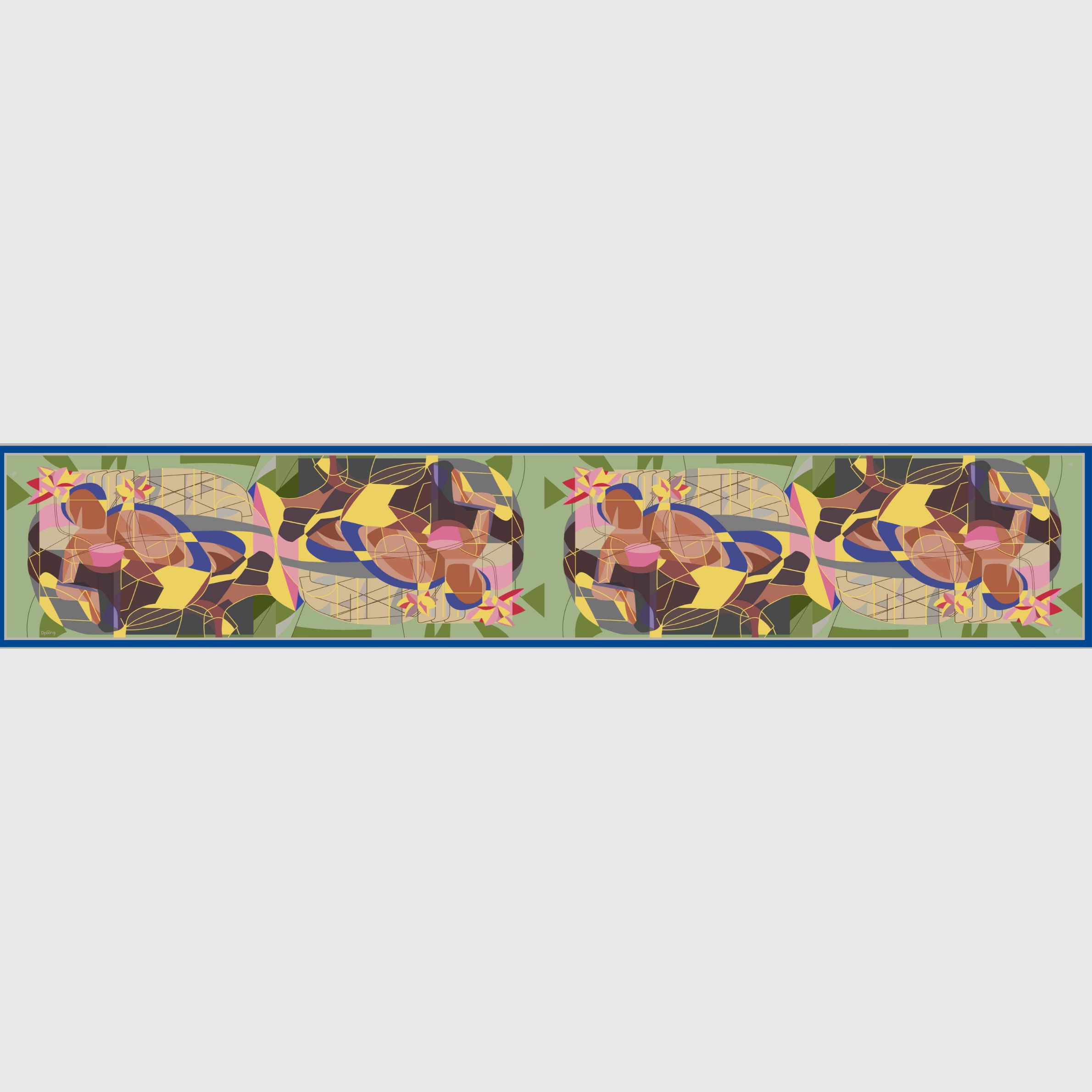 The Guest moves horizontally like a quiet procession, lotus blossoms marking the edges as a welcome. Warm browns, electric blue, and fractured geometry weave together into a landscape that feels both intimate and in motion.