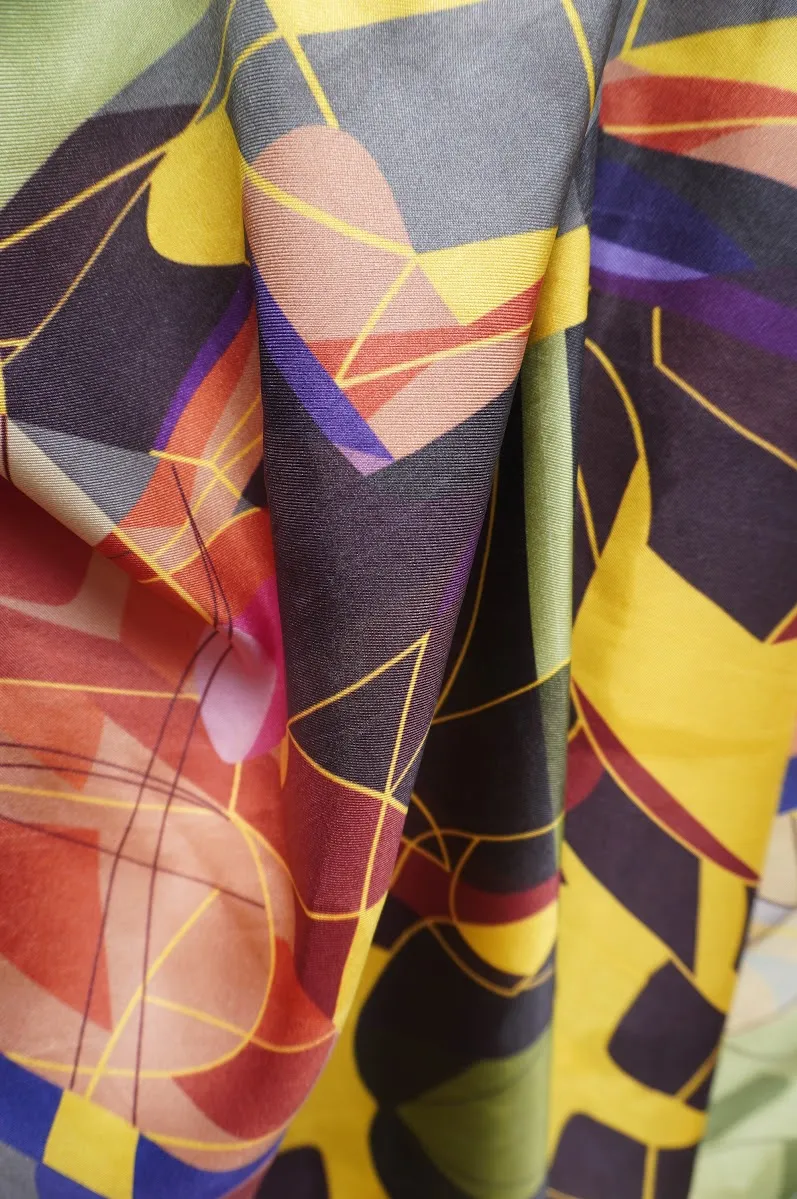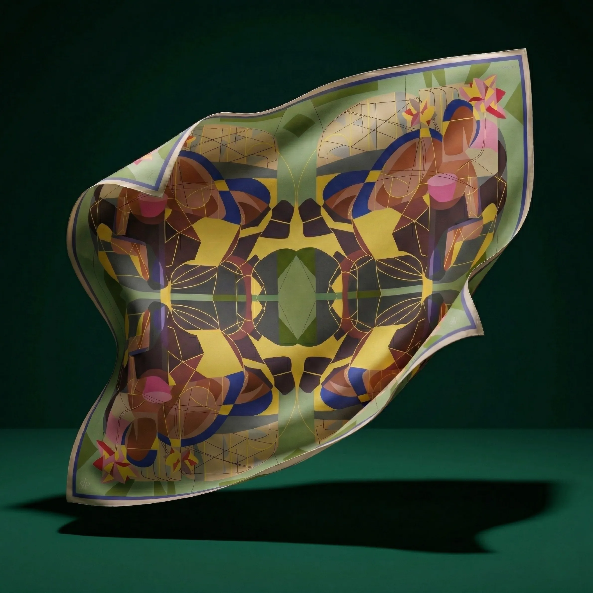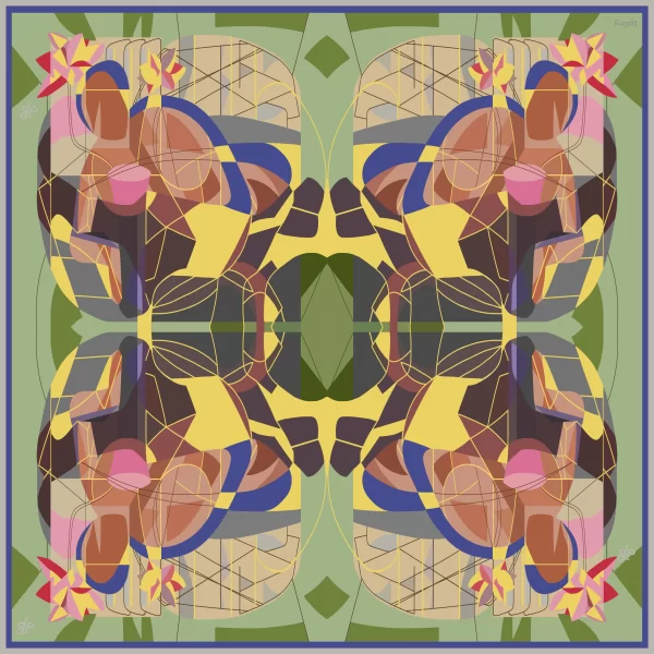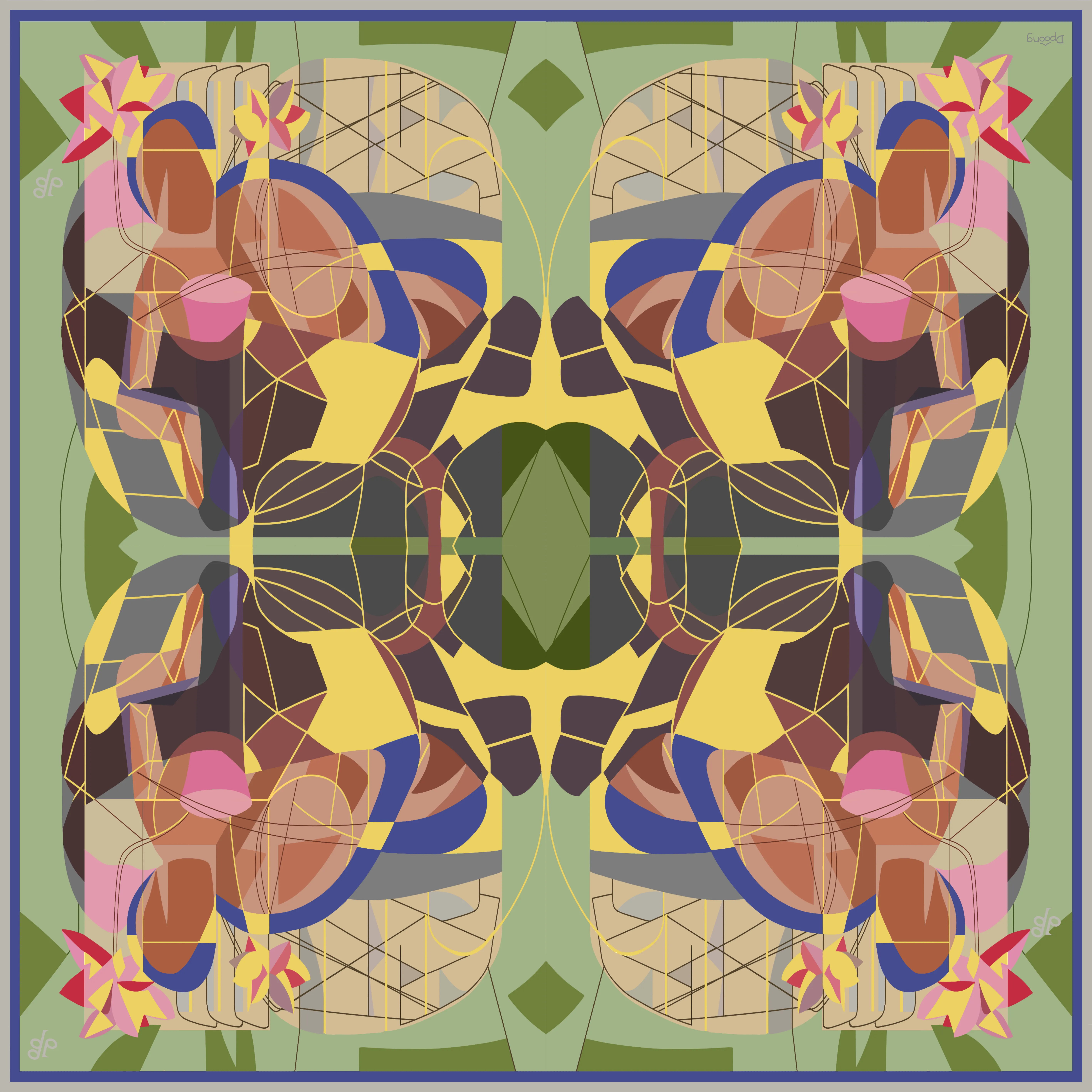Turtle and Sword places two opposing forces in perfect reflection — armored mass meets sharp angular cuts, abstracted into fractured planes of earth, blue, and yellow. The mirrored symmetry locks both energies in suspended tension.